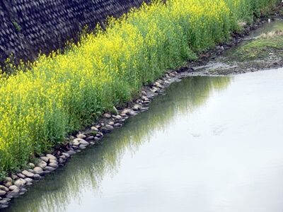 横を流れる恩智川両岸の菜の花(からし菜?)は黄色い花が水面に映り込むほど、勢いが出てきていました。
