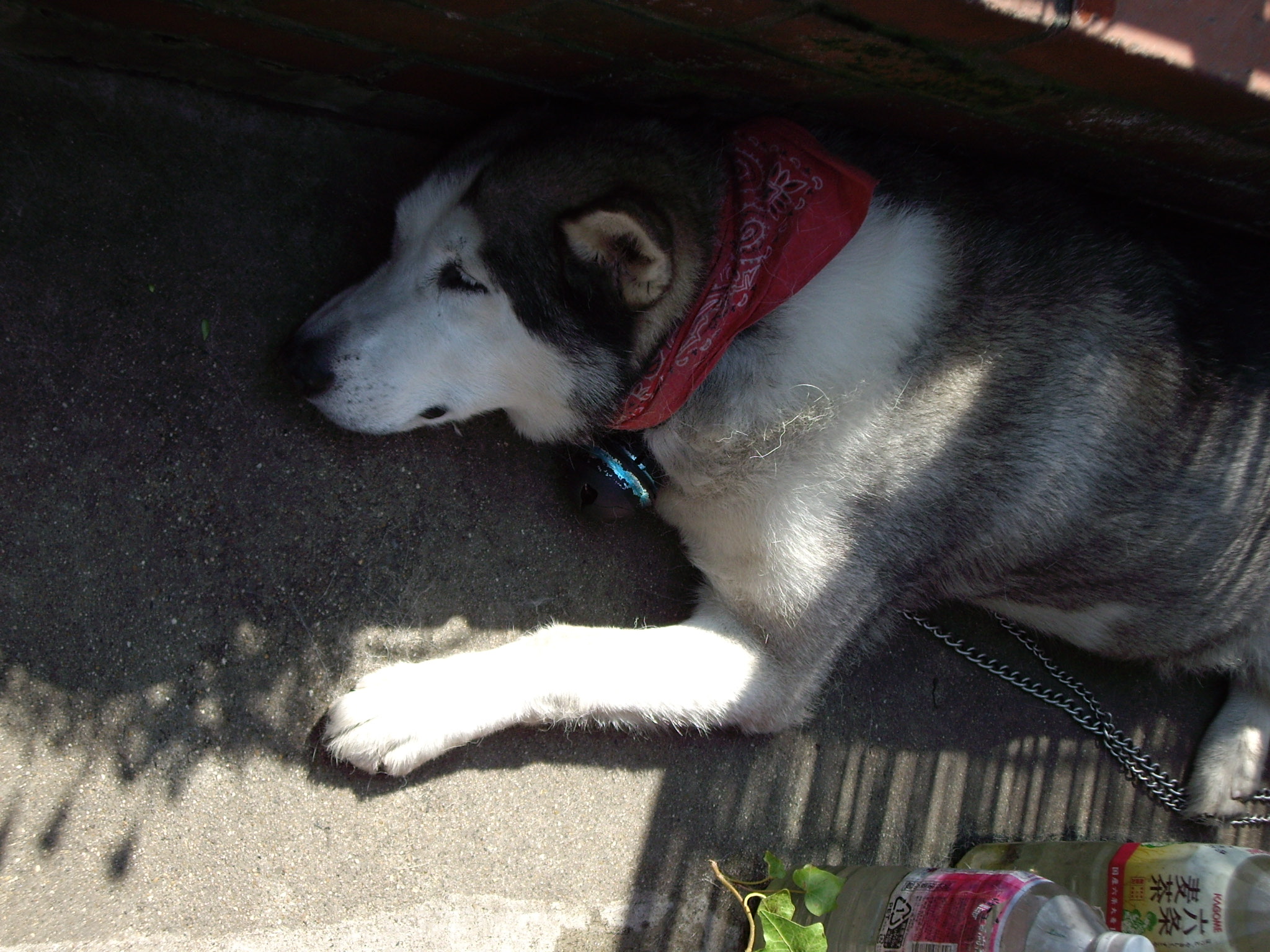 大抵、上の写真のように、自分の小屋から離れた広い場所に寝そべって涼をとっているハスキー犬(と紀州犬のハーフ)のジュディーですが、ここ数日は午前中の一定時間、写真のように小屋の入り口に頭を向ける形で寝そべっています。
