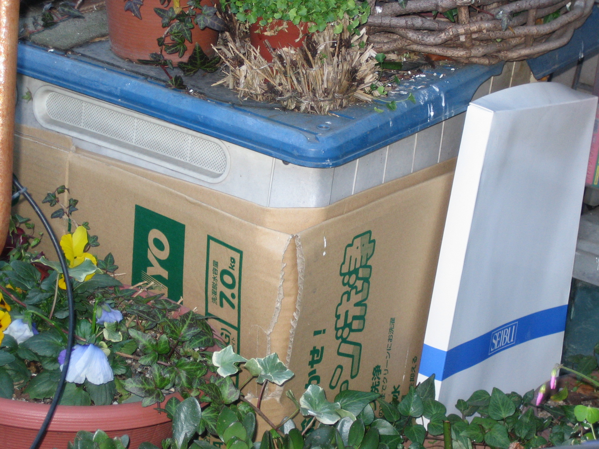 毎年、小屋の中に厚めのシートやダンボールを敷いた後、毛布を入れてやります。格子窓には風除けのビニールを張ってやります。