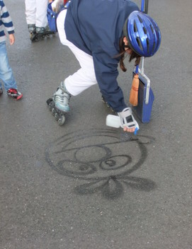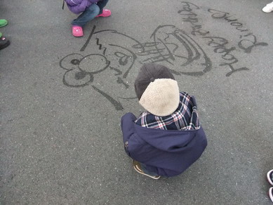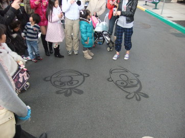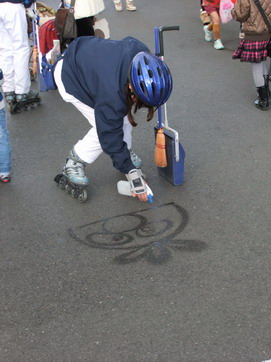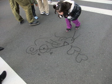 後ろに人の気配を感じ何気なく振り返ってみると、そこには前屈みになって地面を見つめるスウィーパーさん(園内のお掃除担当の方)が居たのですが、その足元にはどんどん絵が描かれていきます。