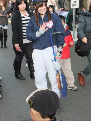 パーク内のあちこちでお菓子の入った籠を持ったスタッフが立っています。
